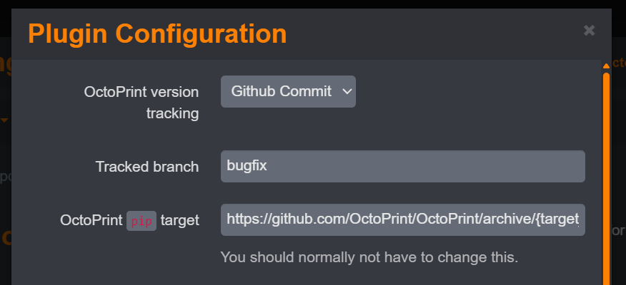 When I change the update settings to "Github Commit" and "bugfix" branch as shown in your post, I get a 404 error from Octoprint. Do I also need to change the target path field (../refs/heads/bugfix.zip?).