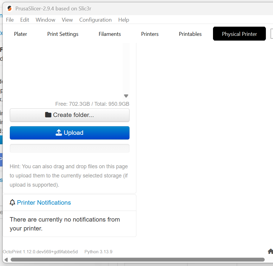 Background: I have PrusaSlicer 2.9.4 configured with a "physical printer" defined for octopi.local using an application API key. My normal workflow is to slice, then click the option to "upload and print", whereupon PrusaSlicer connects to Octoprint, uploads, and starts the print via REST. I can then switch to PrusaSlicer's "Physical Printer" tab, which loads the Octoprint UI using the web browser embedded in PrusaSlicer.