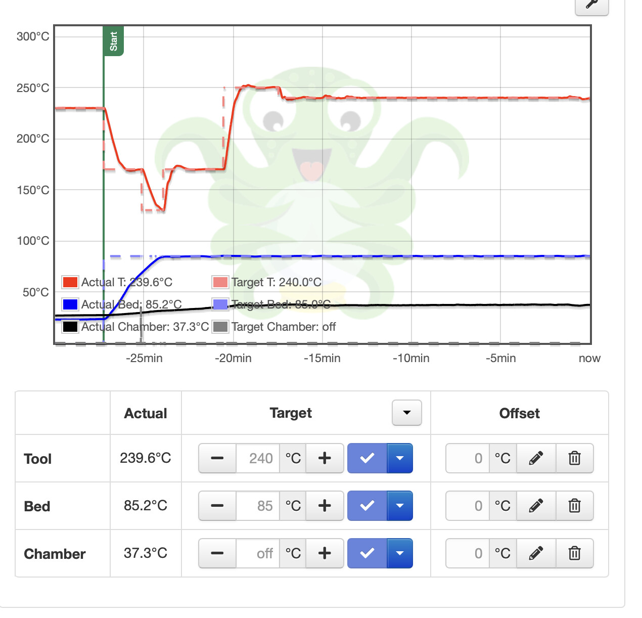 This is interesting. Apparently the info is present to display the chamber set point, but the appropriate field is not being updated. Notice the temp graph is showing the black dotted line info, but the box at the bottom is not being written to, in Octoprint.