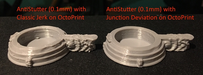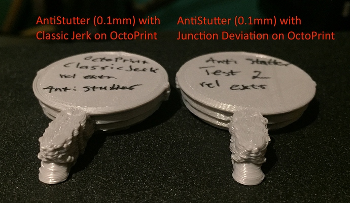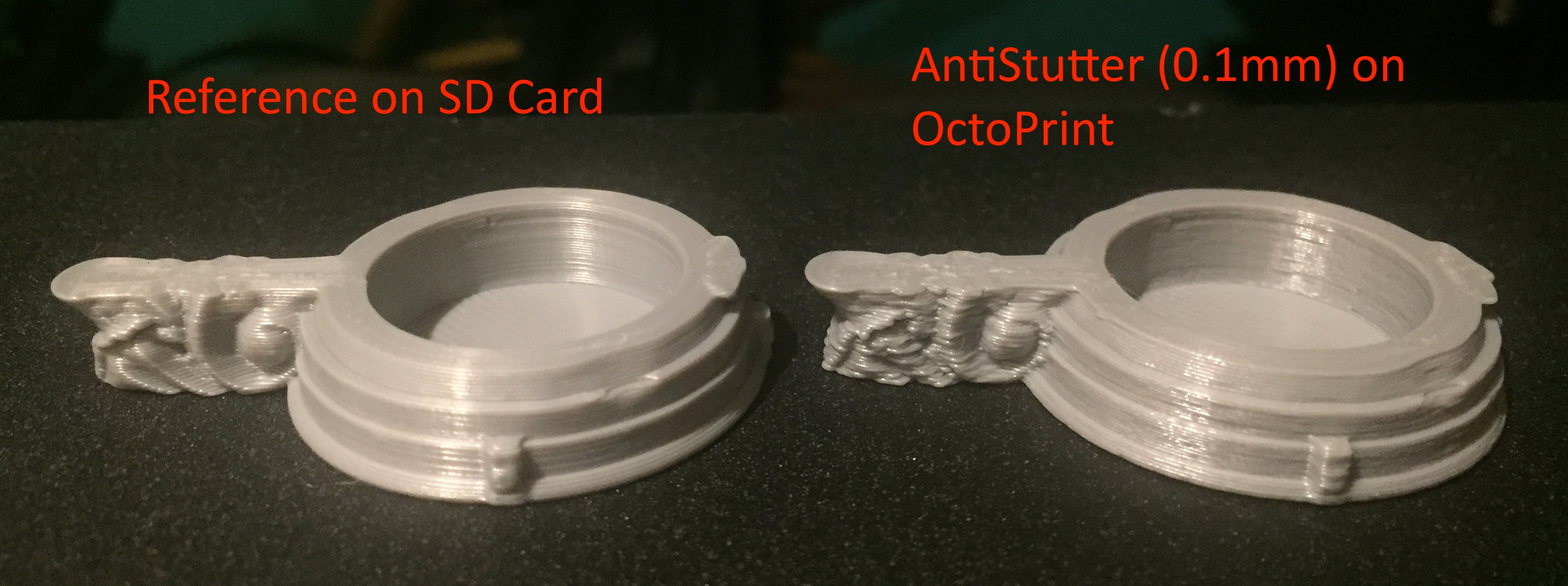 There is still a difference between AntiStutter on OctoPrint and normal file on SD card but the difference is much less than it was without AntiStutter. The advantage of using OctoPrint outweighs the small differences seen in this comparison.