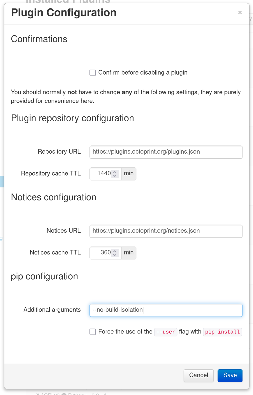 pipto version 25.2 and ensure that OctoPrint won't update it for you (make sure that "" is unchecked in the Software Update settings):- OctoPi: