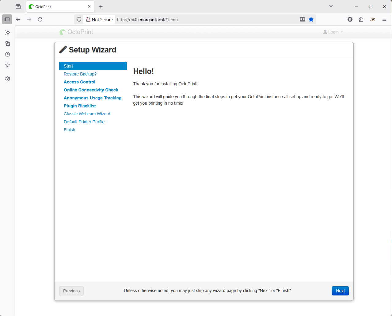 After writing the image on the SD card and booting the RPi with that card, opening the RPi IP in your browser should respond with the Setup Wizard as shown below. On this page you click "Next" and then upload the backup you saved from the previous version.