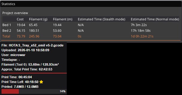 Slicer say 17H18M for the one i doing now, but Octoprint is saying 62H42M